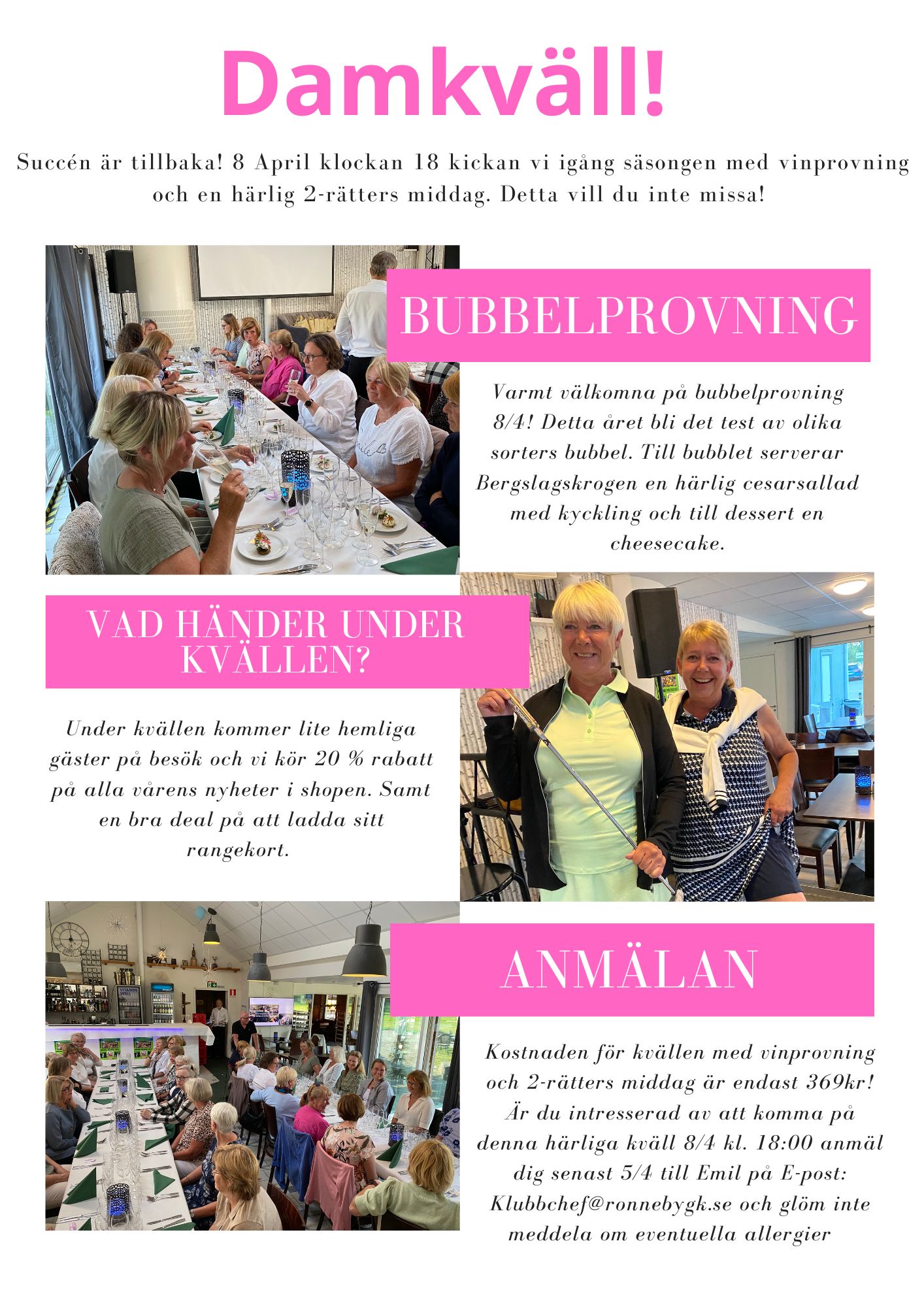 Varmt välkomma till årets damkväll 8/4 klockan 18:00 Anmälan görs till klubbchef@ronnebygk.se senast 5/4 MVH Ronneby Golfklubb